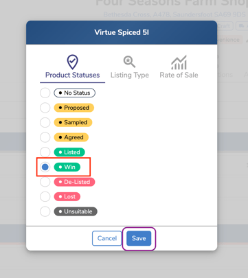 - Select the relevant product status and click ‘Save’ to add or update the status for that location.