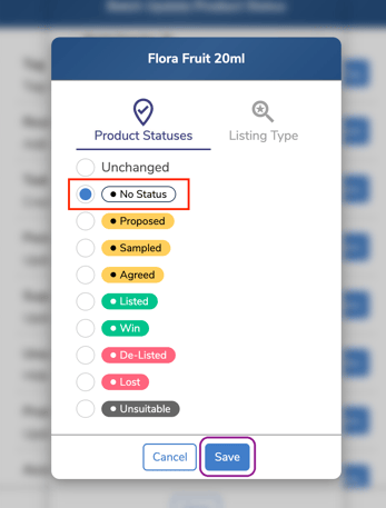 - If you want to Remove a product status, follow steps 1–3. After selecting the relevant product, choose ‘No Status’ and click ‘Save’ to remove the status from the selected location.