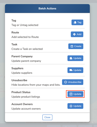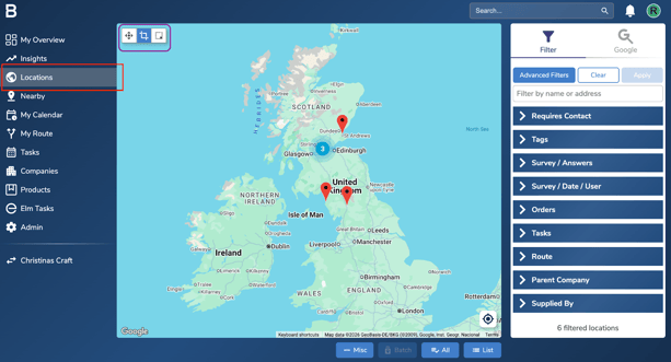 - Go to the ‘Locations’ page in Bowimi and select the locations you want to add or update the product statues for. You can use the filters on the right or the cropping tool in the top-left corner to bulk select locations.