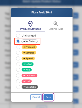 - If you want to Remove product statuses from multiple locations, follow steps 1–4. After selecting the relevant product, choose ‘No Status’ and click ‘Save’ to remove the product status from the selected locations.