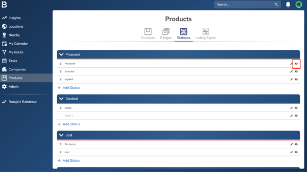 iii. To hide a specific product status from showing up in the account, click the ‘Eye’ icon next to it. The status will fade out, indicating it’s hidden. To unhide the status, simply click the ‘Eye’ icon again and it will become visible.