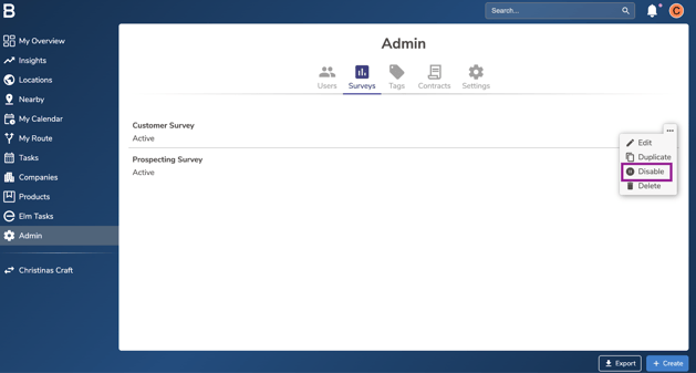 You can hide a survey from reps in the field, without losing all of the data associated with the survey by clicking “Disable”. This is almost always a better idea than deleting the survey.