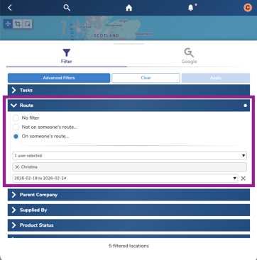 Under the Routes Filter, click on “Someones’ Route” and select your name and date scheduled for visit.
