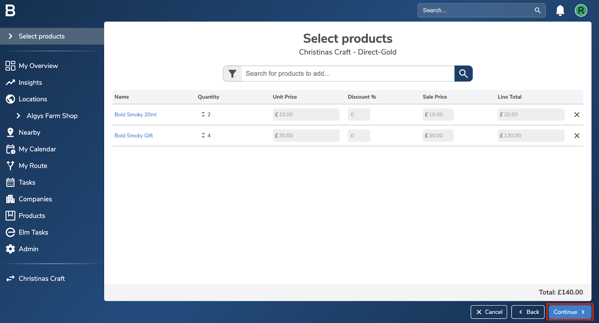 - Edit the quantity for each product as needed. You can also apply a discount in the ‘Discount %’ column, if applicable. Once all details are entered, click “Continue”.