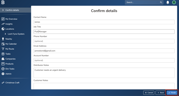 - Fill in the order details and add any notes for the distributor, customer, or internal team in the relevant Notes sections. Click “Finish” to place the order.