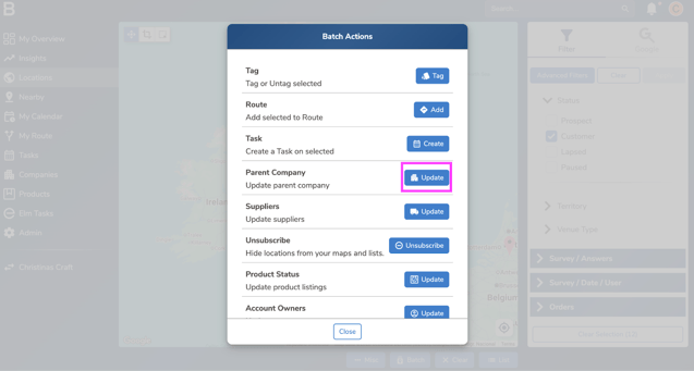 - Select the locations you want to remove the Parent company from. You can use the cropping tool on the top left corner or the filters on the right to filter locations.