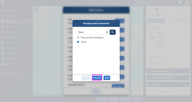 - Search for a parent company to remove on the pop up.